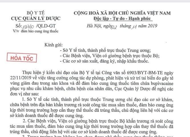 24/11/2019 03:58Cục Quản lý Dược gửi công văn hỏa tốc yêu cầu thay thế thuốc tê Bupivacaine