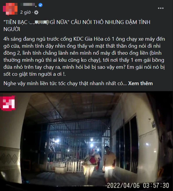 Theo nội dung được chia sẻ trên mạng xã hội, vào khoảng gần 4h sáng 6/4, người tài xế đang ngủ trước cổng khu dân cư Gia Hòa (quận 9, TP. Hồ Chí Minh) thì có 1 người đàn ông chạy xe máy đến gõ cửa nói muốn đặt xe đến Bệnh viện Nhi Đồng 2. Sau đó nam tài xế và người khách đến đón một cô gái trên tay đang bồng một đứa nhỏ bị sốt, co giật tím tái người.