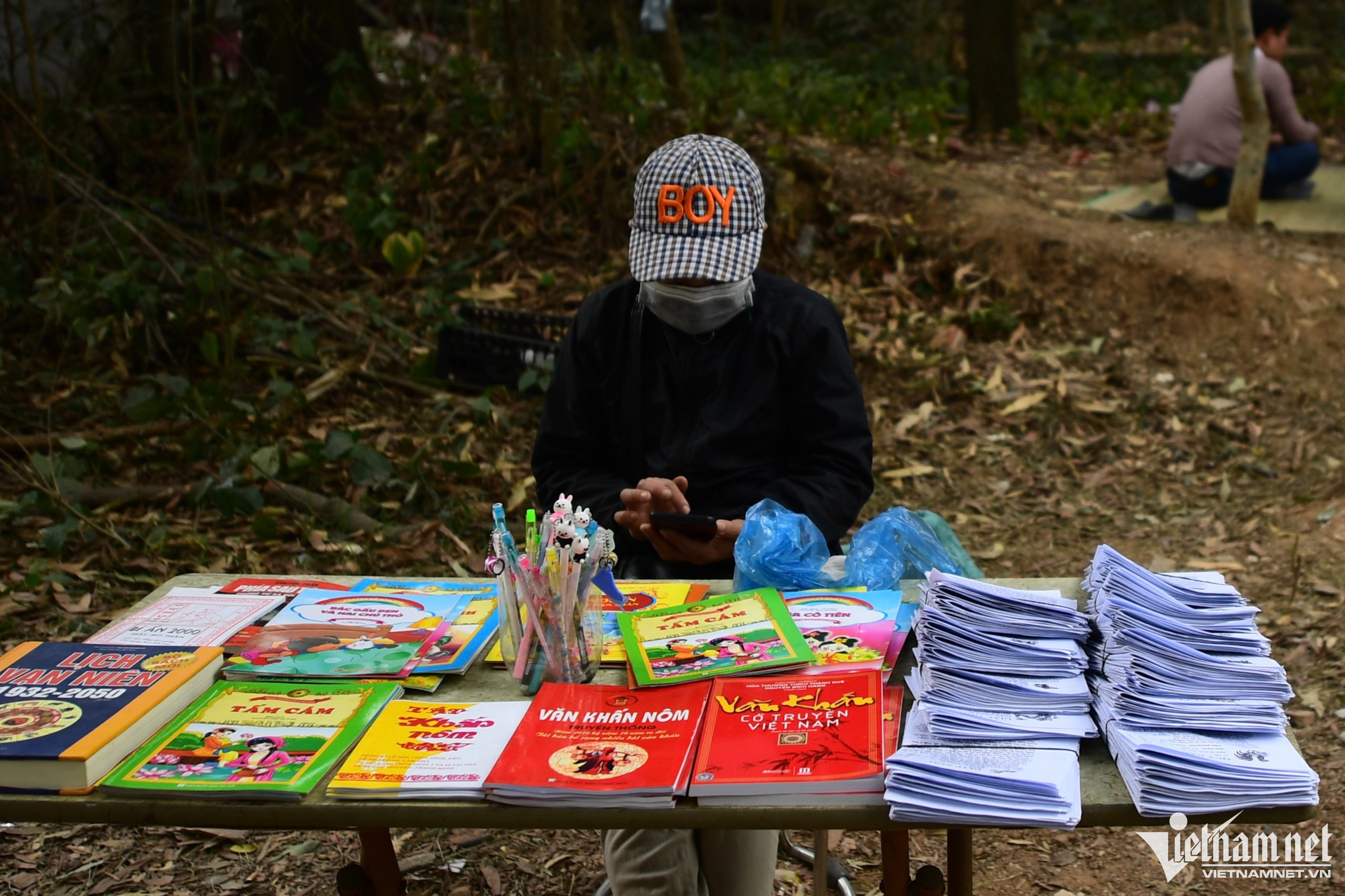 Một sạp bày bán văn khấn từ sách in đến photo với nhiều mức giá cũng được dựng ngay ở chân đền.