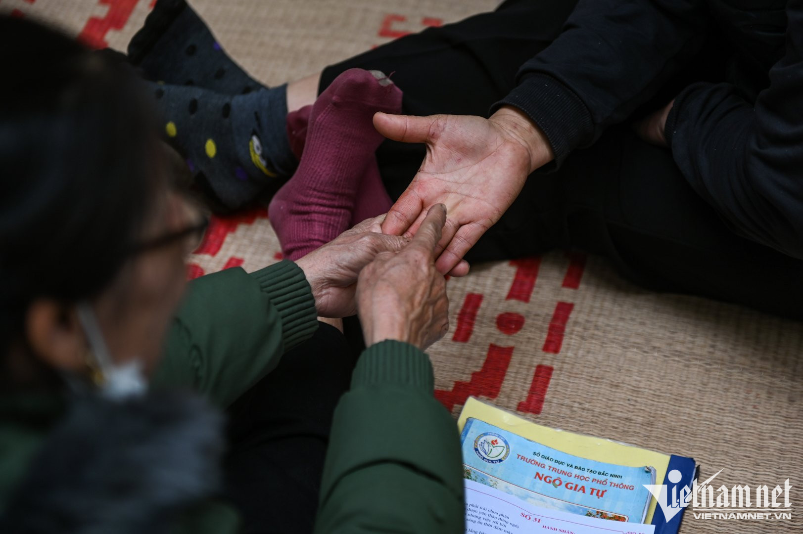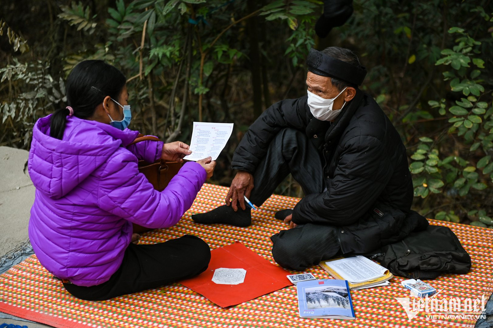 Hàng chục vị thầy bói trải chiếu trong sân đền Sái để luận quẻ đầu năm mới cho những ai vừa rút quẻ ra mà không dịch được.