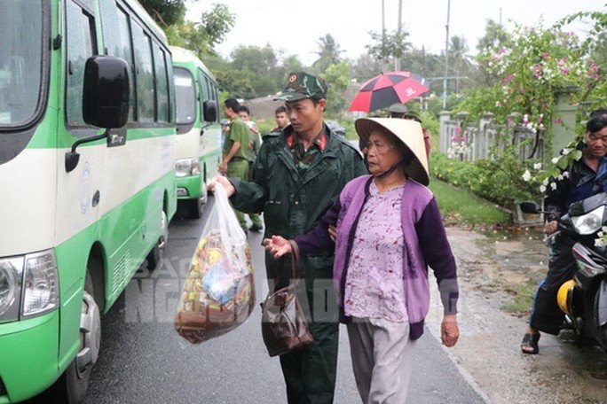 Lúc 7 giờ sáng cùng ngày, 2 chuyến xe đầu tiên đã đưa hàng chục bà con ở thôn đến các khu tập trung phòng tránh bão. Hình ảnh các cụ già, các em nhỏ được lực lượng chức năng hỗ trợ, bồng bế lên xe thật sự xúc động.