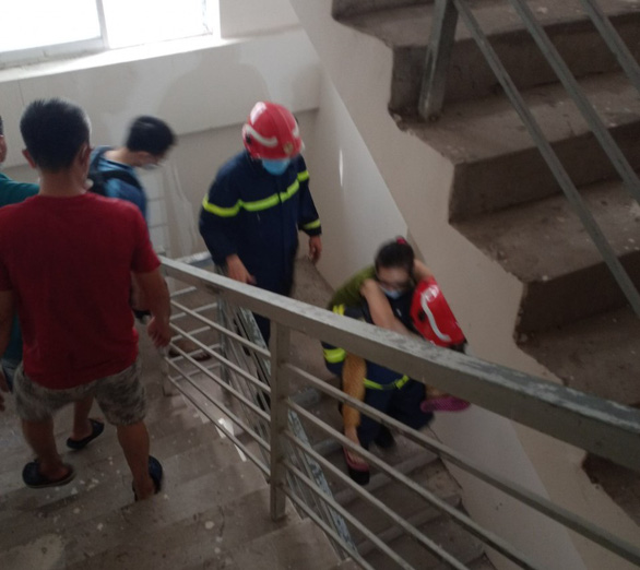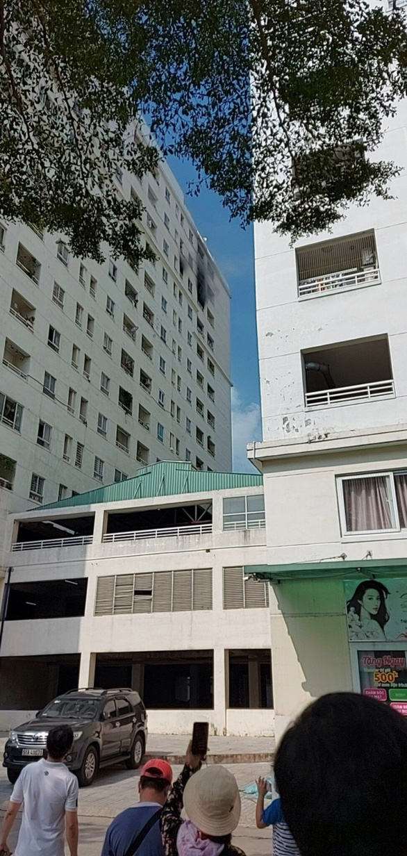 "Tôi đang ở trong nhà thì nghe mọi người la hét um sùm nên mở cửa xem thì biết cháy chung cư. Tôi lật đật chạy thang bộ xuống đất muốn hụt hơi, may mà không sao", một cư dân kể.