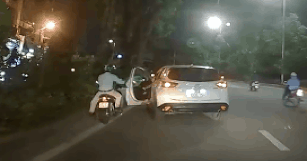 Ngay sau đó, một tài xế Grab phóng xe máy đuổi theo chiếc ô tô. Vị khách ngồi sau xe cũng ra hiệu cho tài xế dừng lại. Chiếc CX5 áp sát xe máy nói trên vào lề. Nam thanh niên cầm lái giận dữ bước xuống, cầm gậy đánh vào đầu tài xế Grab. Ngay sau đó, anh ta lên xe bỏ đi.