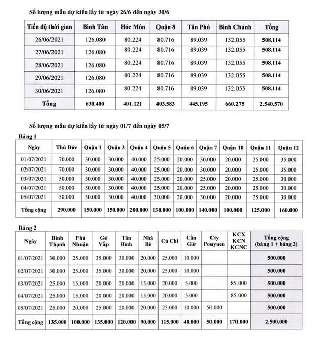 Theo đó, hoạt động lấy mẫu dự kiến được thực hiện từ ngày 26/6 đến ngày 30/6 tại quận 8, quận Bình Tân, quận Tân Phú, huyện Bình Chánh, huyện Hóc Môn và từ ngày 1/7 đến ngày 5/7 tại TP. Thủ Đức và các quận huyện còn lại, theo phương pháp lấy mẫu gộp 10, gộp 15 với số lượng 500.000 người/ngày.