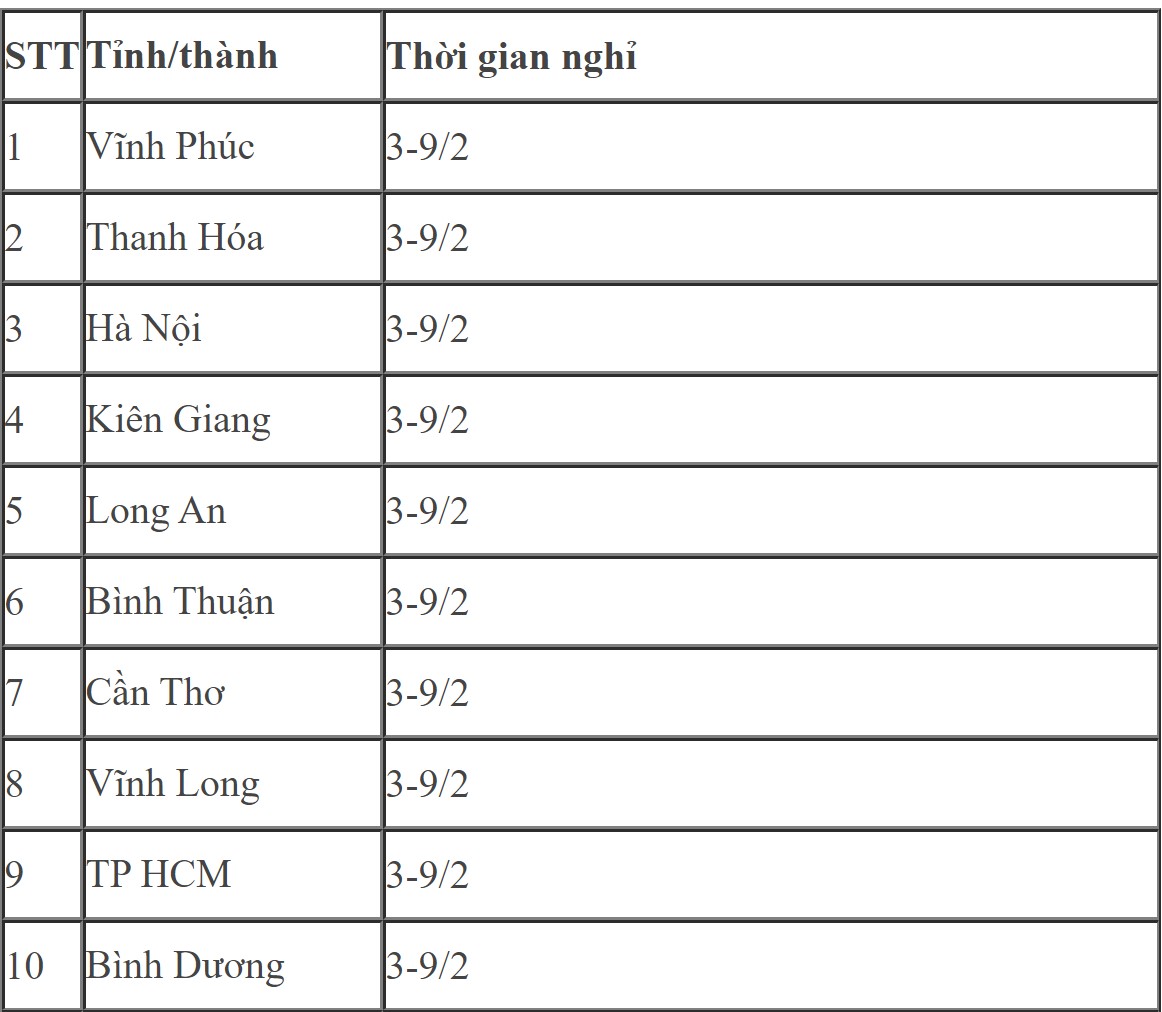 Một số tỉnh chỉ cho học sinh nghỉ học ngắn ngày và bắt đầu đi học trở lại vào các ngày 5/2. Còn một số tỉnh cho học sinh nghỉ học không xác định thời hạn (cho đến khi có thông báo đi học trở lại) như: Khánh Hòa, Nghệ An, Hà Tĩnh, Điện Biên.