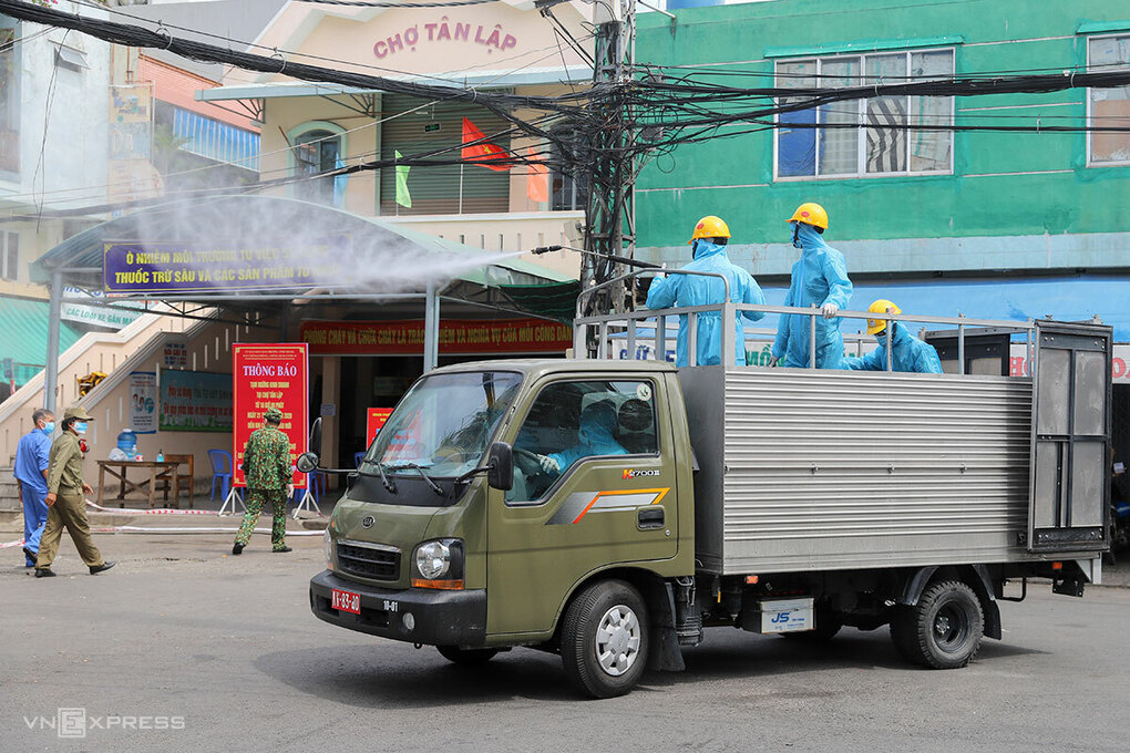 Tại chợ Siêu Thị trên đường Võ Văn Tần, quân đội cũng phun hoá chất từ trong ra ngoài. Khu chợ này được Sở Y tế thông báo có hai ca dương tính với nCoV và phải dừng hoạt động từ 16h ngày 21/8, cùng với chợ Tân Lập.