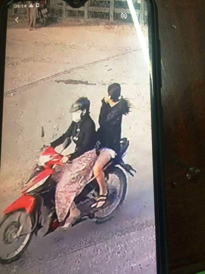 Lúc này, 1 phụ nữ đội mũ bảo hiểm, đeo khẩu trang bịt mặt, mặc áo khoác và váy chống nắng, đi xe máy hiệu Wave RS màu đỏ đen chưa xác định biển số vào trường, rồi tiến đến chỗ em N. ngồi hỏi mượn điện thoại, nhưng em N. không cho.