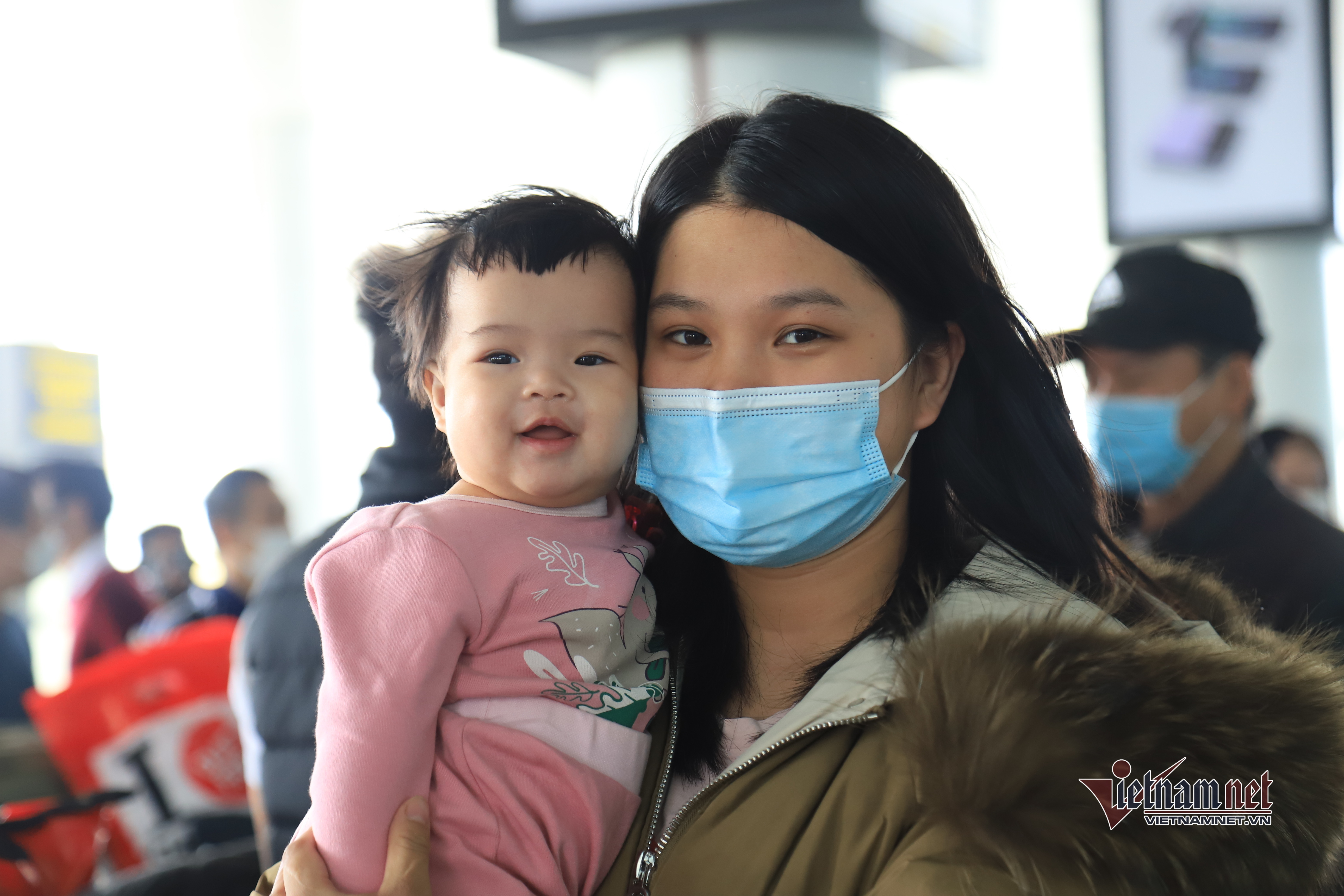 Hạnh phúc trong vòng tay người nhà, chị Nguyễn Thị Hương (23 tuổi) cùng cô con gái 6 tháng tuổi là một trong những người đầu tiên bước xuống máy bay và được Thứ trưởng Ngoại giao Phạm Quang Hiệu tặng hoa chào mừng trở về.