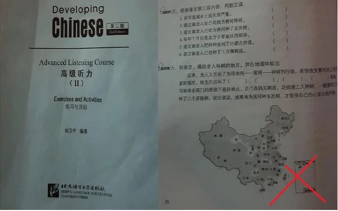 Trang 70 giáo trình Nói 6 (Developing Chinese) dùng cho sinh viên ngành Ngôn ngữ Trung Quốc của ĐH Công nghiệp Hà Nội có in bản đồ “đường lưỡi bò”.