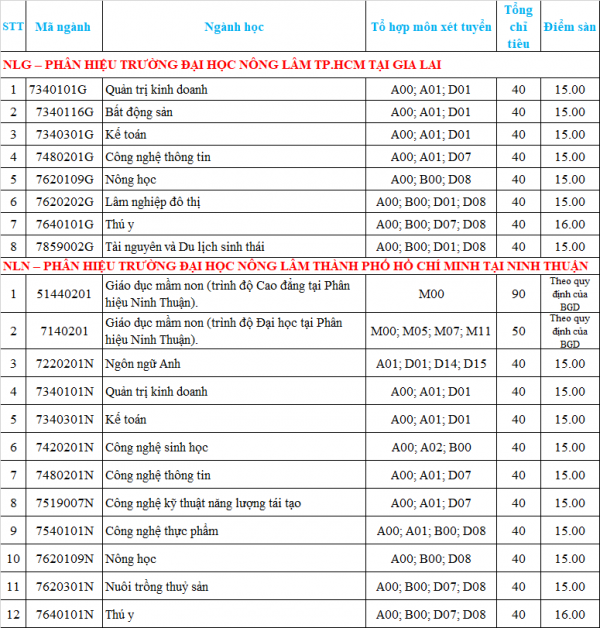 Tại Phân hiệu Gia Lai và Ninh Thuận: Điểm sàn được thông báo ở mức 15 điểm cho các tất cả các ngành, riêng ngành thú y là 16 điểm.