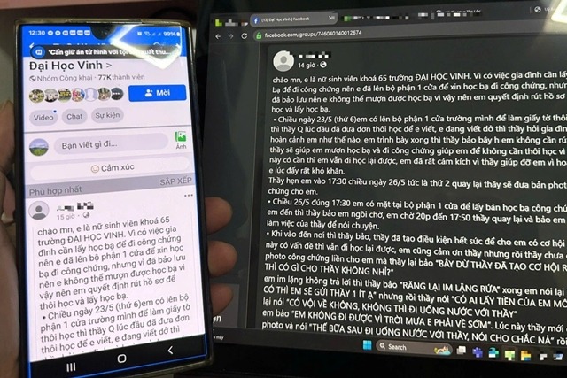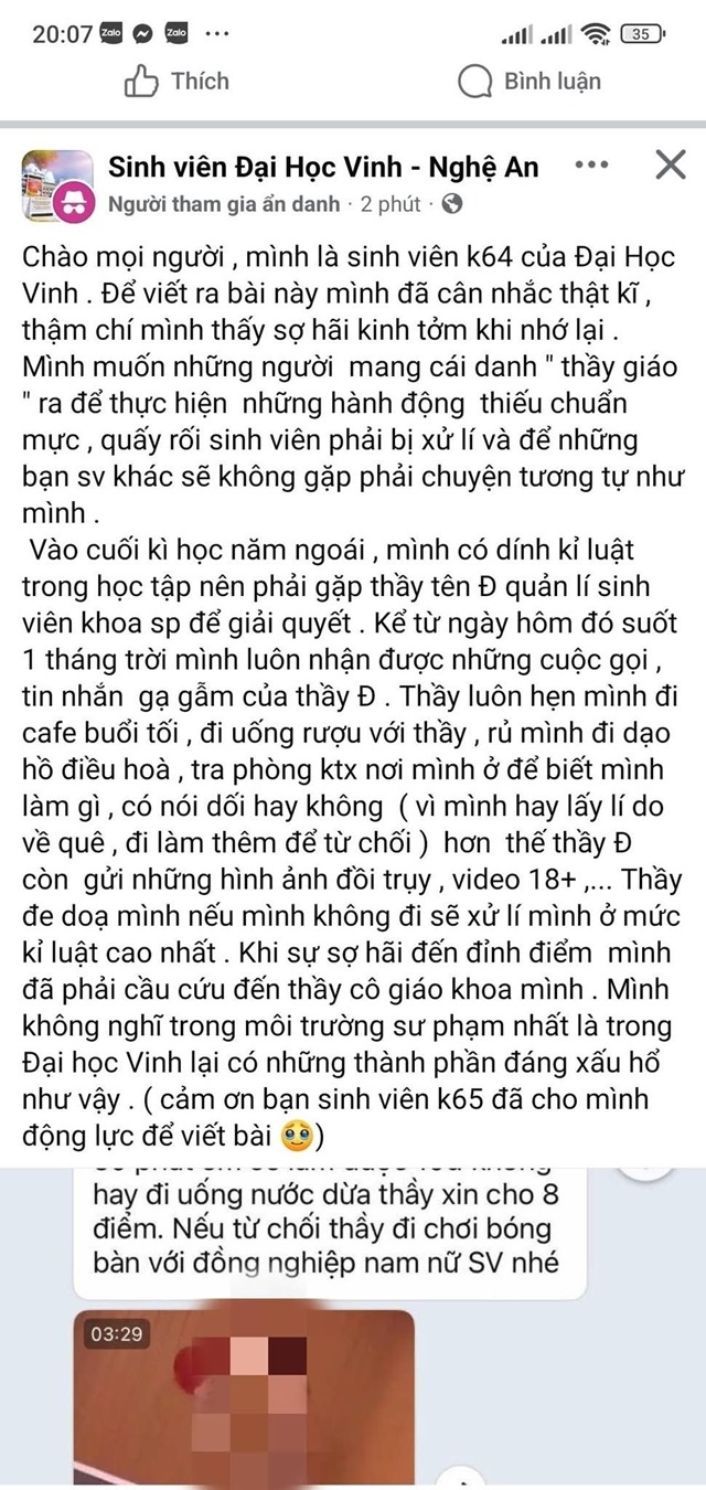 Trước đó, cộng đồng mạng xôn xao vì 2 bài đăng của 2 nữ sinh, tố cán bộ, thầy giáo ở trường Đại học Vinh có hành động khiếm nhã, gạ gẫm mình. Đính kèm đó là những tin nhắn ghi lại cuộc nói chuyện của hai bên.Xe máy