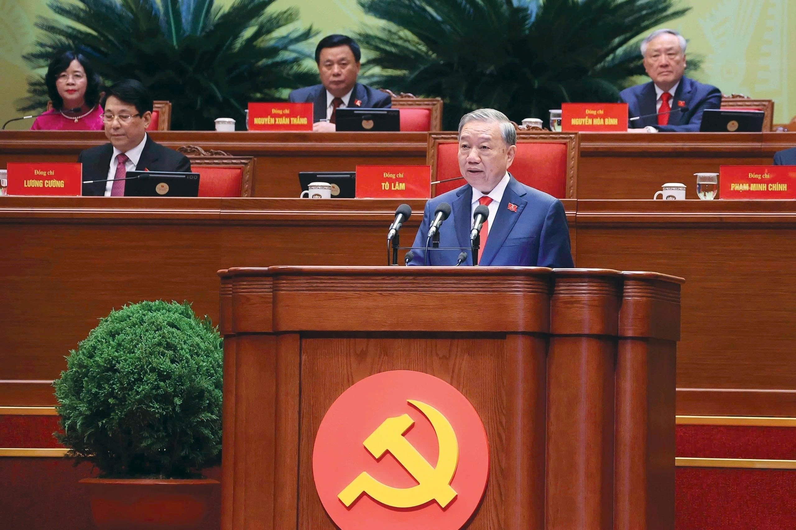 Thay mặt Đoàn Chủ tịch, ông Lê Minh Hưng – Ủy viên Bộ Chính trị, Bí thư Trung ương Đảng, Trưởng Ban Tổ chức Trung ương – đã trình bày Báo cáo của Ban Chấp hành Trung ương Đảng khóa XIII về công tác nhân sự Ban Chấp hành Trung ương Đảng khóa XIV.