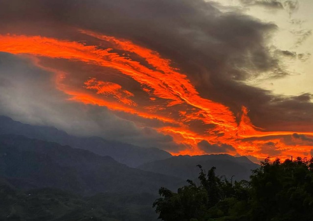 Chiều 19/9, trên MXH xuất hiện những hình ảnh về một đám mây lạ trên bầu trời Sapa (Lào Cai). Theo đó, trên bầu trời xuất hiện một đám mây màu đỏ rực, hình dáng giống chim phượng hoàng đang dang rộng đôi cánh.