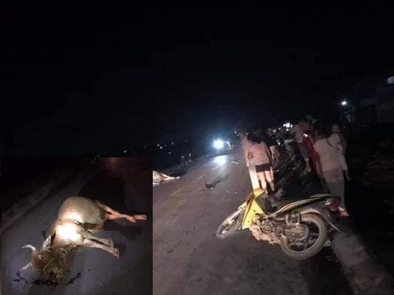 Khi vừa đi qua cổng trụ sở UBND xã Triệu Thành khoảng 150m, xe máy do anh T. điều khiển bất ngờ đâm trực diện vào con bò đang băng qua đường.