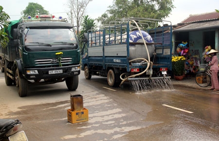 Tại xã Tam Ngọc, cánh tài xế phải điều xe tưới nước đến để hạn chế bụi. Ảnh: Tiến Hùng. |