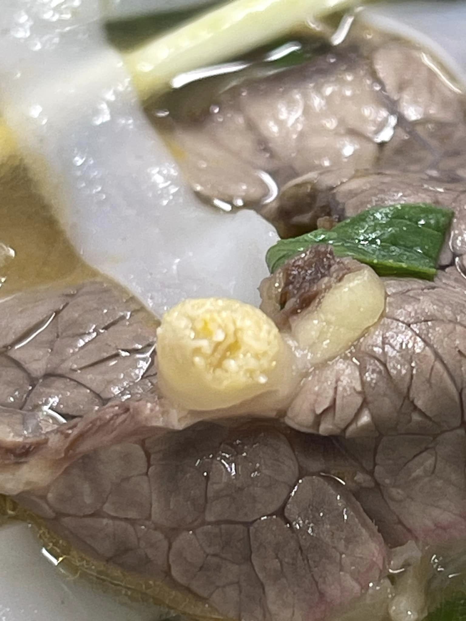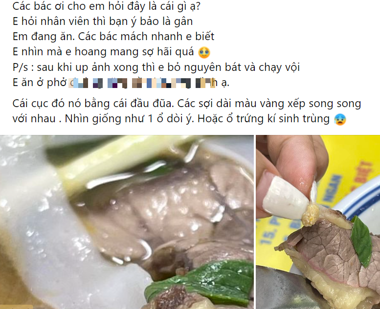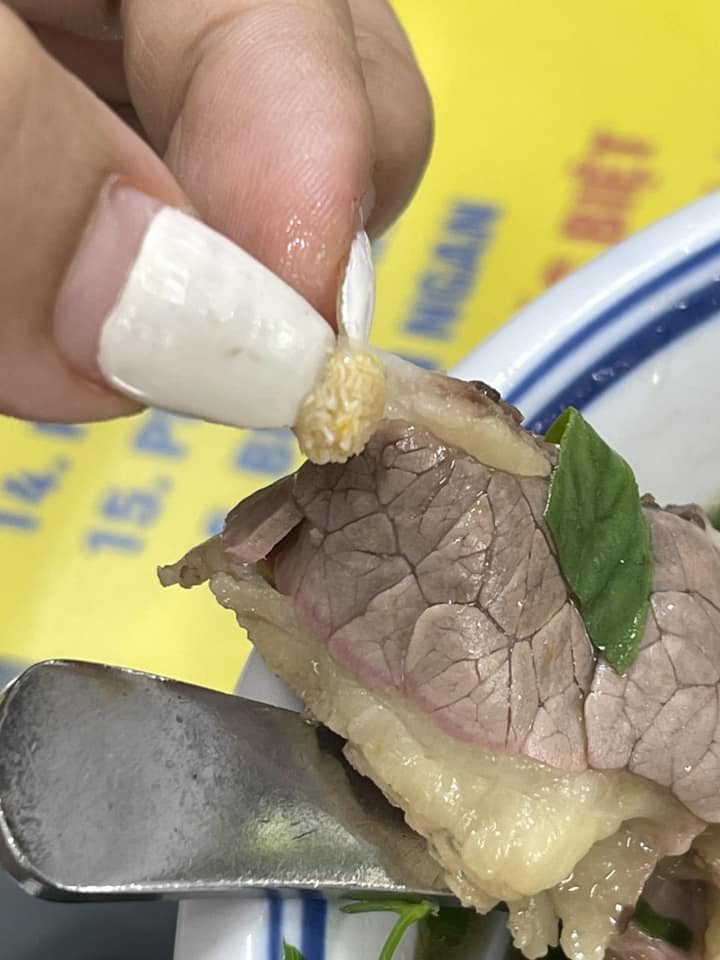 Mới đây, một bài đăng chia sẻ của một vị khách đi ăn phở bò phát hiện miếng thịt có một cục tròn to như đầu đũa, bên trong là những sợi dài màu vàng vàng xếp xen kẽ với nhau. Mặc dù sau khi nhân viên quán phở cho biết đây là gân bò nhưng vị khách vẫn hoang mang đăng đàn trên mạng xã hội để hỏi mọi người.