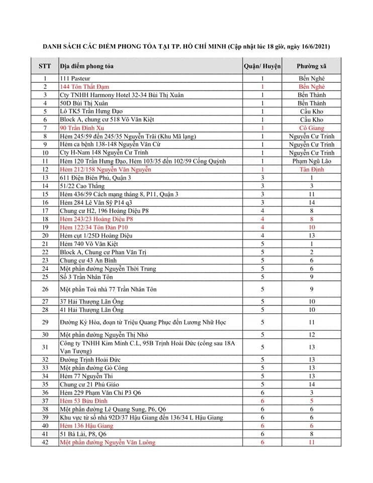 17/06/2021 05:31Danh sách 371 điểm phong tỏa liên quan Covid-19 ở TP.HCM