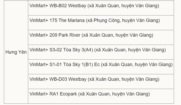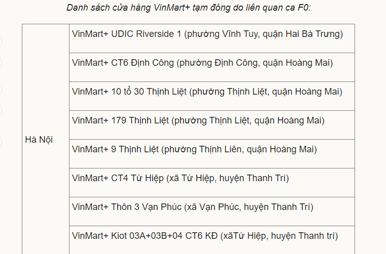 Đến 13h chiều 2/8, doanh nghiệp này xác định có 8 siêu thị VinMart, 15 cửa hàng tiện ích VinMart+ phải rà soát y tế do liên quan tới các ca F0 của nhà cung cấp Thanh Nga và phối hợp các biện pháp phòng dịch phù hợp.Trong đó, 8 siêu thị VinMart tại các quận Thanh Xuân, Hà Đông, Cầu Giấy, Hoàng Mai và Long Biên. Còn 15 cửa hàng VinMart +, gồm 8 cửa hàng tại Hà Nội, tập trung tại quận Hai Bà Trưng, Hoàng Mai và huyện Thanh Trì. 7 cửa hàng VinMart+ còn lại tại huyện Văn Giang, tỉnh Hưng Yên.