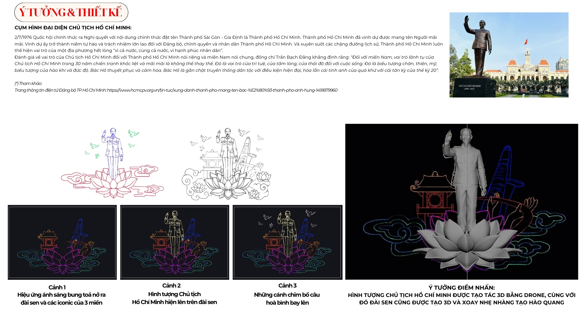 Trong suốt quá trình sáng tạo, anh Trí cho biết bản thân và và ekip đề cao tinh thần dân tộc và mong muốn truyền tải hình ảnh Việt Nam hòa bình, vươn lên và hội nhập ra thế giới. Những hình ảnh như xe tăng tiến vào Dinh Độc Lập, chân dung Chủ tịch Hồ Chí Minh, chim bồ câu, hoa sen, hay cụm từ "Việt Nam – Kỷ nguyên vươn mình" đều là những biểu tượng được đạo diễn và ekip chắt lọc, dựng nên bằng sự tự hào.