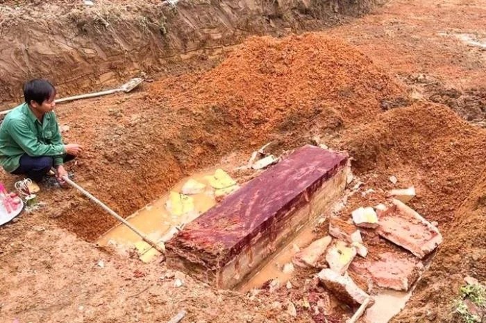 Người dân đã đập hết phần cứng bên ngoài để thuận tiện cho việc di chuyển quan tài ra khỏi vị trí móng nhà. Sau khi đập hết phần cứng giống đá lát nền khá dày bên ngoài, lộ ra một cỗ quan tài bằng gỗ màu đỏ thẫm. Người dân cho rằng đây là kiểu an táng "trong quan ngoài quách" thời xưa.
