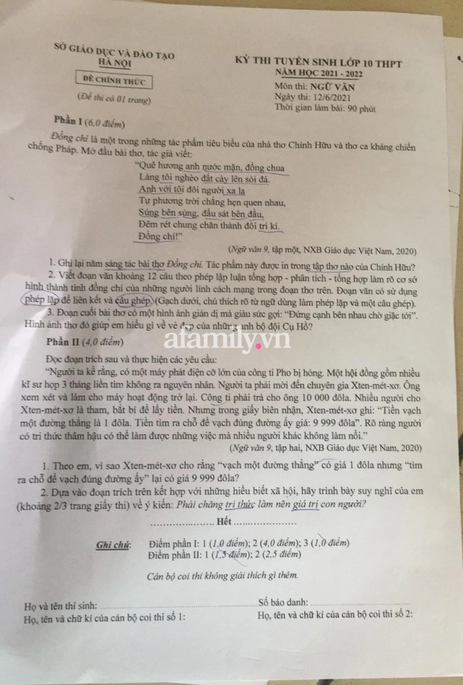 Theo ý kiến nhiều phụ huynh, đề thi Ngữ Văn tuyển sinh lớp 10 năm học 2021 - 2022 của Hà Nội vừa sức học sinh và nội dung đề thi đều đã được học, ôn rất kỹ.