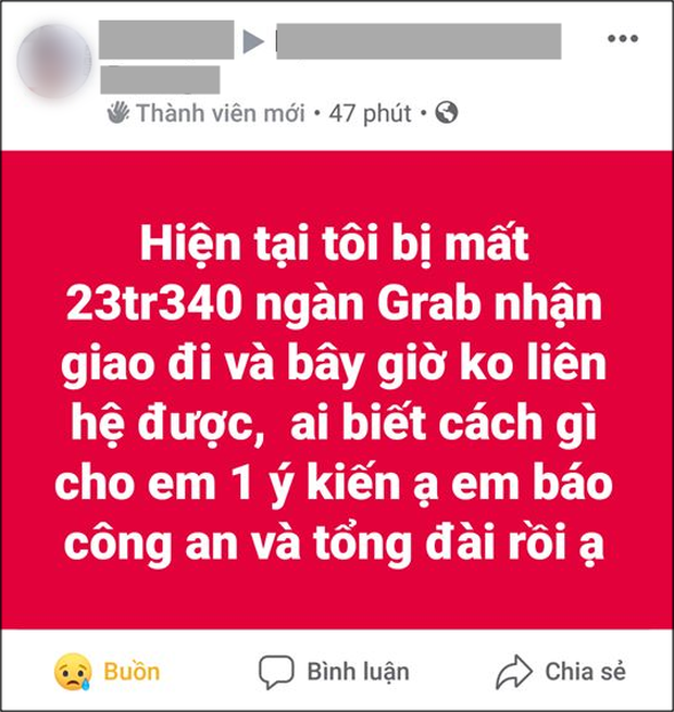 "Tôi là khách hàng đặt xe Grab nhưng tôi không đi. Tôi có báo tài xế này là tôi không đi và nhờ giao hàng, anh ta hỏi giao gì tôi bảo là giao tiền cho chị gái tôi là 23tr340k. Anh ta nhận giao và lấy tiền ship cao hơn, phí book xe là 66k nhưng anh ta lấy tôi 75k.