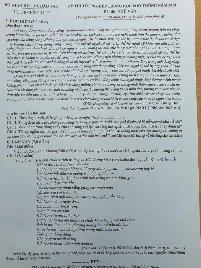 Dưới đây là đề thi môn Ngữ văn tốt nghiệp THPT năm 2024 chính thức của Bộ GD-ĐT: