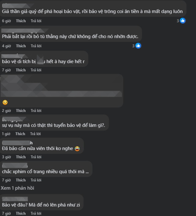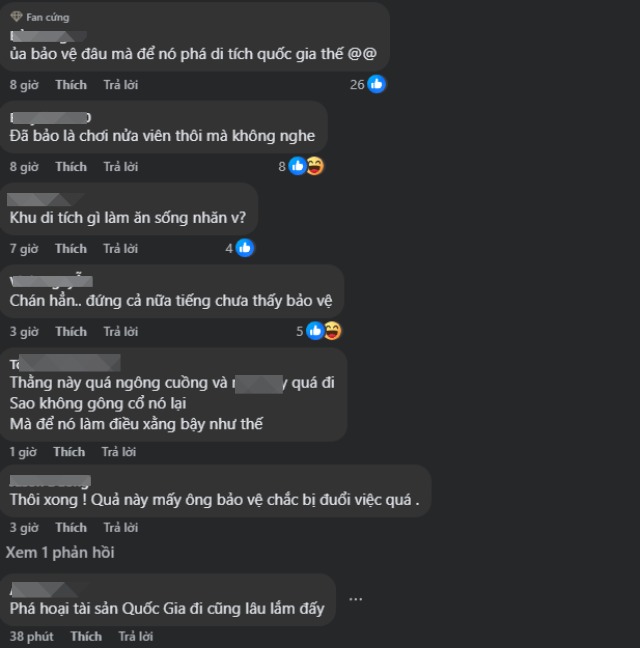 Về phần cư dân mạng, hàng loạt bình luận thể hiện sự phẫn nộ, bức xúc vì hành động của người đàn ông trong clip. Không chỉ vậy, nhiều người còn đặt câu hỏi về vai trò của lực lượng bảo vệ trong sự việc này khi Bảo vật quốc gia bị quấy phá nhưng không một ai xuất hiện ngăn cản.