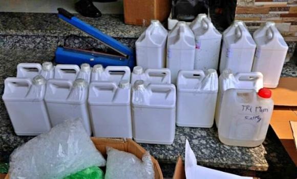 300 kg nguyên liệu bao gồm phèn chua, dung dịch, hương liệu pha chế không rõ nguồn gốc.
