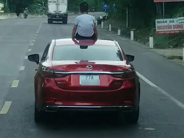 Trước đó, ngày 15/7, trên mạng xã hội Facebook lan truyền hình ảnh gây bức xúc về việc một cháu bé ngồi trên mui ô tô trong khi xe đang lưu thông trên đường.