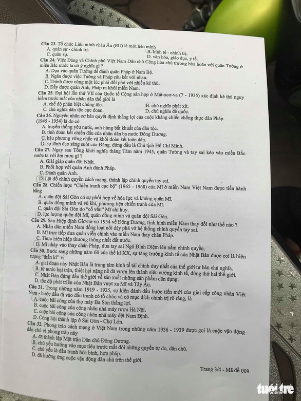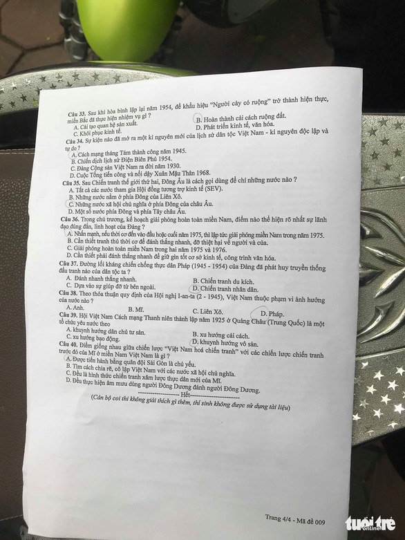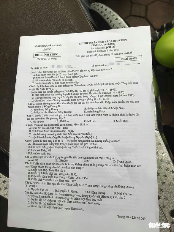 Đề thi lịch sử lớp 10 tại Hà Nội năm nay có 40 câu, thời gian làm bài 60 phút. Một số thí sinh đánh giá đề "không có gì khó". Buổi thi cuối cùng của Hà Nội diễn ra êm ả.
