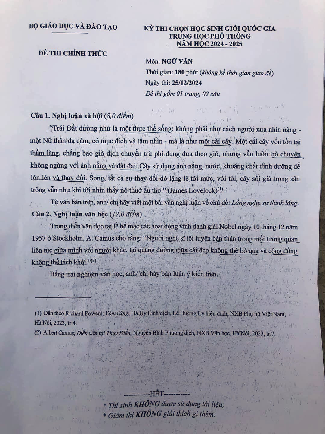 Đề Văn thi chọn học sinh giỏi quốc gia năm học 2024-2025 như sau: