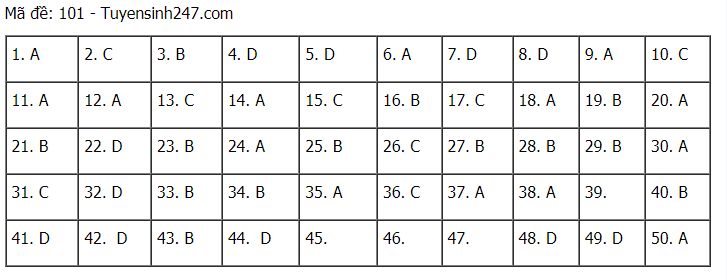 Đáp án môn Toán thi tốt nghiệp THPT 2021 mã đề 101: