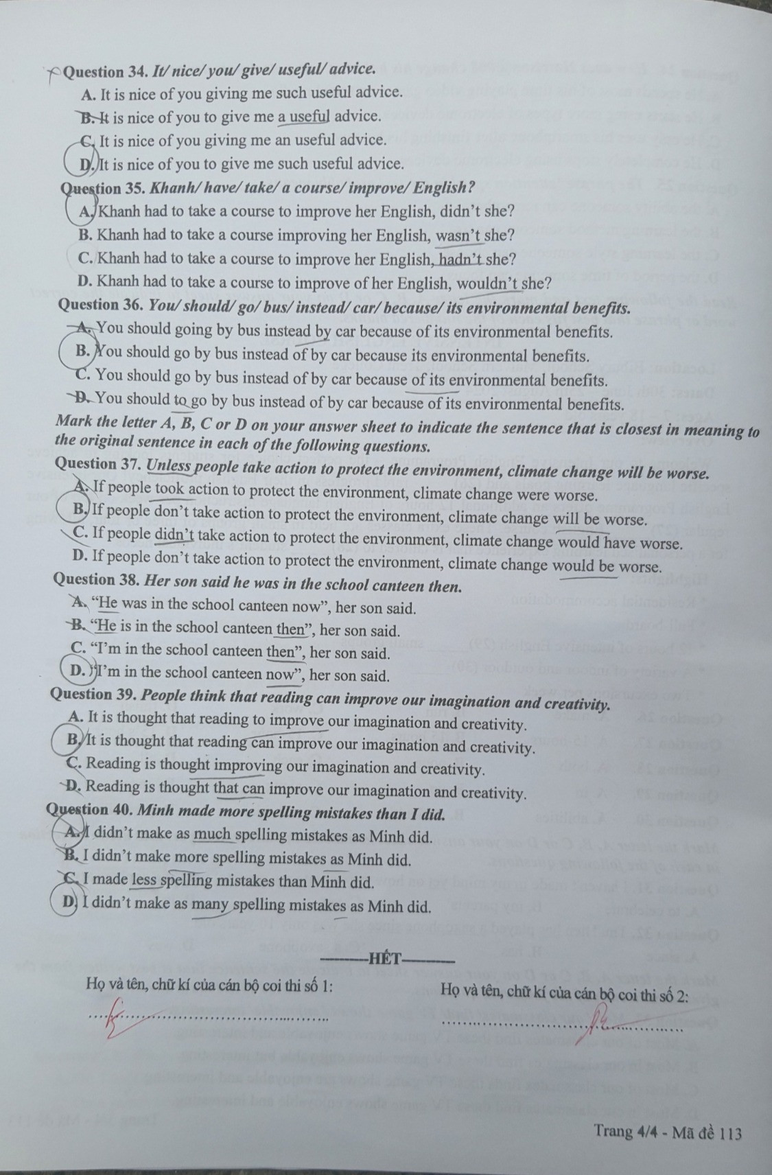 Dưới đây là đề thi vào lớp 10 môn tiếng Anh của Hà Nội năm 2024 (mã đề 113):