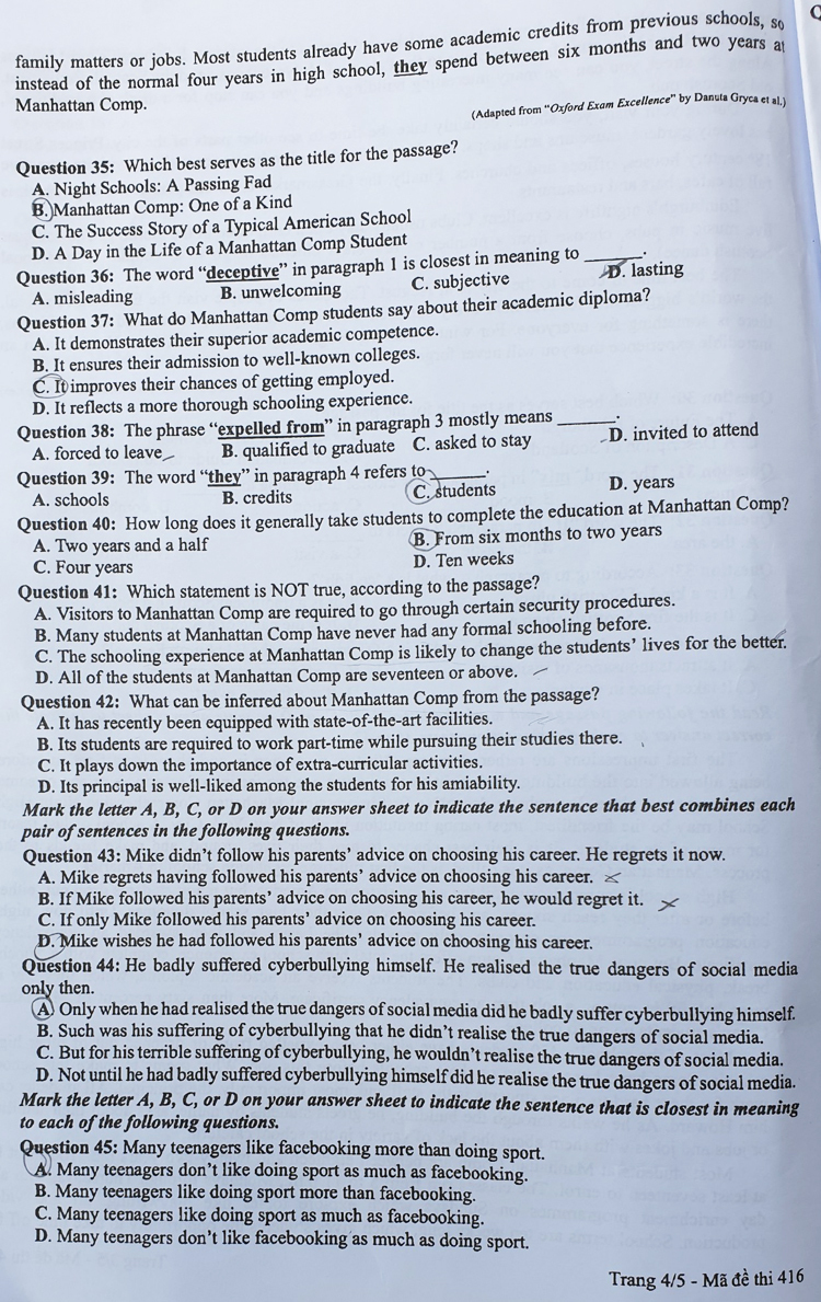 Đáp án mã đề 416 (tiếp tục cập nhật)