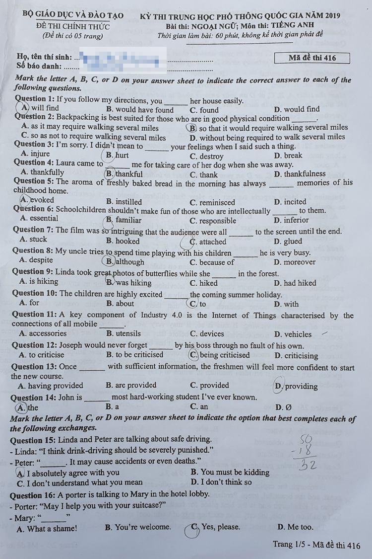 26/06/2019 23:11Đề và đáp án Tiếng Anh thi THPT quốc gia