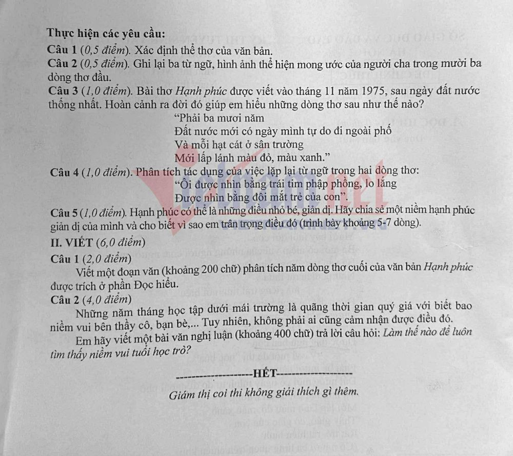 Theo cô Thảo, đề thi gồm 2 phần (Phần 1: Đọc hiểu - 4 điểm; Phần 2: Viết - 6 điểm) theo đúng dạng đề minh họa của Sở GD-ĐT đã công bố nên học sinh không bị bất ngờ. Ngữ liệu lựa chọn trong đề là bài thơ Hạnh phúc của nhà thơ Giang Nam. Đây là một bài thơ hay, dễ khơi gợi cảm xúc cho người đọc. Phần Đọc hiểu có định hướng rõ rệt các mức độ tư duy từ nhận biết đến thông hiểu. Từ câu 1 đến câu 3 là những câu hỏi về đặc trưng thể loại, đọc hiểu nội dung và cảm thụ.