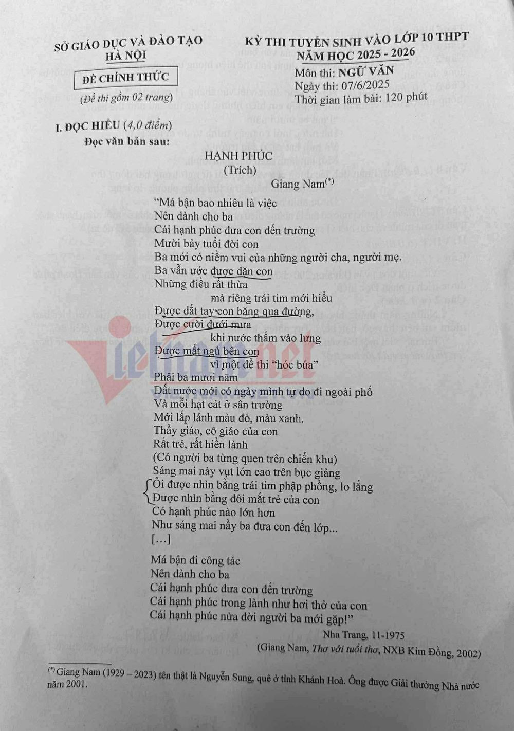 Cụ thể, phần I (Đọc hiểu) với ngữ liệu một bài thơ tự do, dù không nằm trong SGK nhưng nội dung gần gũi, xúc động về tình cảm của cha dành cho con, về niềm hạnh phúc giản dị. Các câu hỏi vừa sức, không làm khó học sinh.