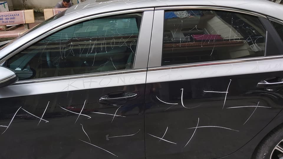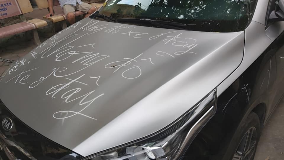 Bài đăng tải của tài khoản facebook K.C về hình ảnh một chiếc xe hộp bị viết vẽ bậy lên thân xe với nội dung: "Không đỗ xe ở đây".