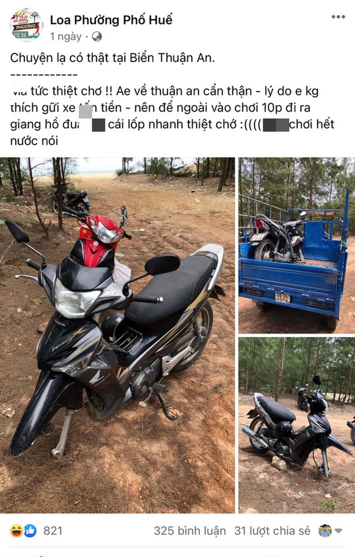 Trước đó, chiều ngày 1/5, tài khoản Facebook Phương Châu đăng tải lên MXH câu chuyện, xe máy để ở bờ kè biển Thuận An khoảng 10 phút đã bị kẻ gian lấy mất bánh trước. Người đàn ông sau đó đã thuê xe chở chiếc xe máy của mình về mà không trình báo với cơ quan chức năng