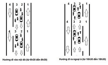- Buổi sáng (từ 6h30 đến 8h30): Sử dụng làn đường số 2, 3, 4 cho chiều đi từ ngoại thành vào nội thành; làn đường số 1 cho chiều đi từ nội thành ra ngoại thành.