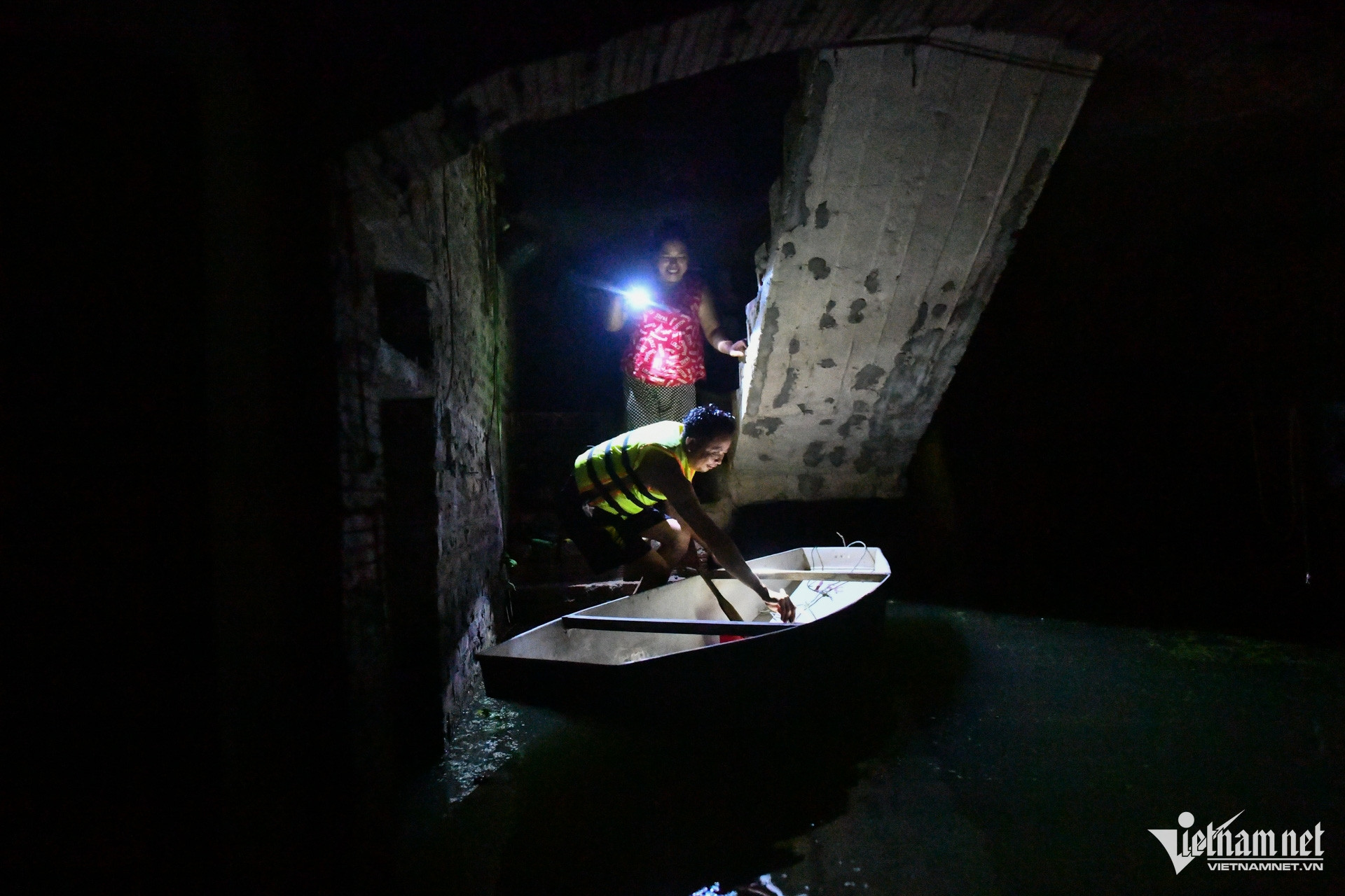 Con đường bê tông từ đê sông Bùi dẫn vào nhà bà Đỗ Thị Thành (69 tuổi, thôn Nhân Lý, xã Nam Phương Tiến) những ngày này trở thành tuyến đường thủy. Hằng ngày, bà Thành phải dùng chiếc thuyền tôn mong manh bơi ra đầu làng để chở nước sạch về ăn.