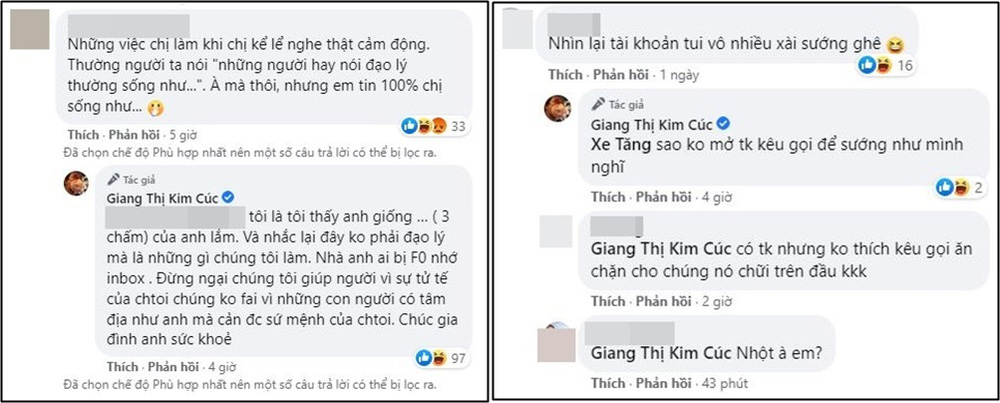 Nhiều người đã tràn vào trang cá nhân của cô để "chất vấn", thậm chí nói thẳng nghi ngờ "bớt xén" từ thiện. Giang Kim Cúc lập tức đáp trả rất gay gắt, tranh cãi tay đôi với dân mạng. Thậm chí, cô còn mỉa mia một người chỉ trích mình: "Nhà anh ai bị F0 nhớ inbox".