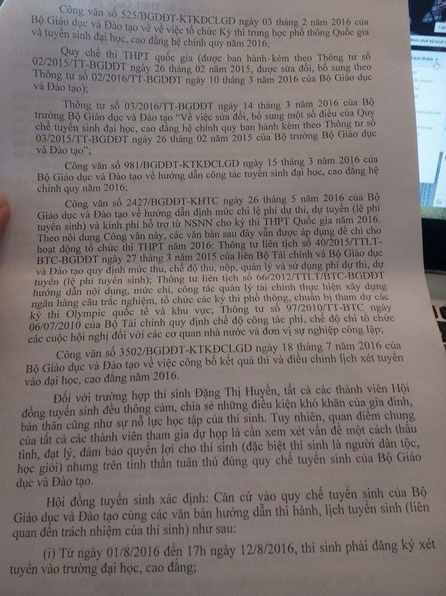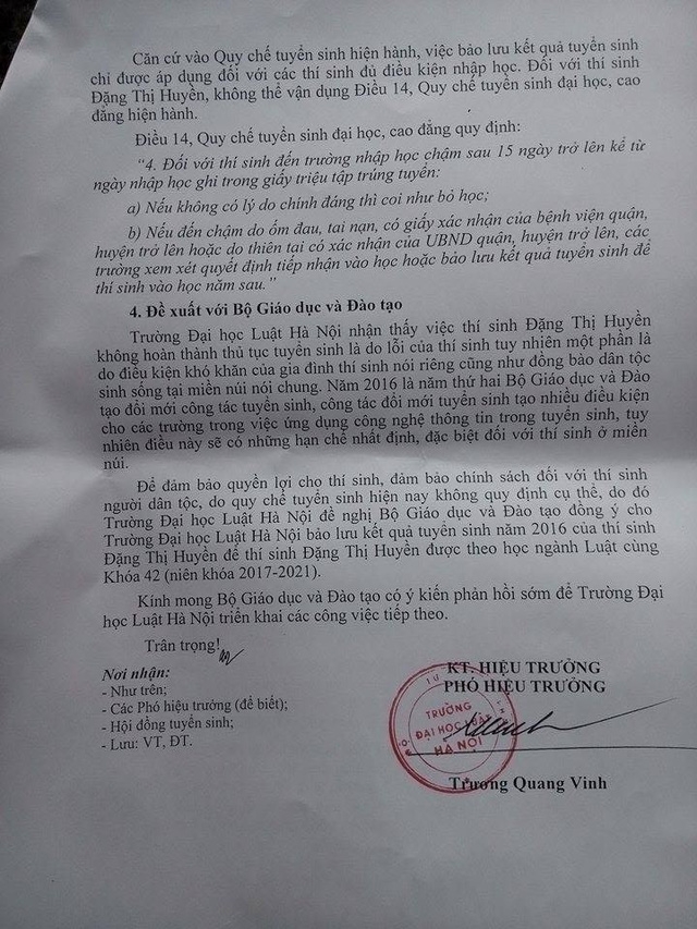 Để đảm bảo quyền lợi cho thí sinh, đảm bảo chính sách đối với thí sinh người dân tộc, do quy chế tuyển sinh hiện nay không quy định cụ thể, do đó Trường Đại học Luật Hà Nội đề nghị Bộ Giáo dục và Đào tạo đồng ý cho Trường Đại học Luật Hà Nội bảo lưu kết quả tuyển sinh năm 2016 của thí sinh Đặng Thị Huyền để thí sinh Đặng Thị Huyền được theo học ngành Luật cùng Khóa 42 (niên khóa 2017-2021).
