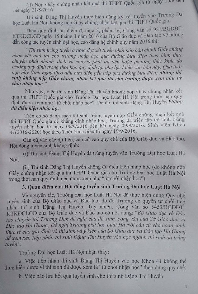 Do đó, trường Đại học Luật Hà Nội nhận thấy: Việc tiếp nhận thí sinh Đặng Thị Huyền vào học Khóa 41 không thể thực hiện được vì thí sinh đã được xem là “từ chối nhập học” theo đúng quy chế”.