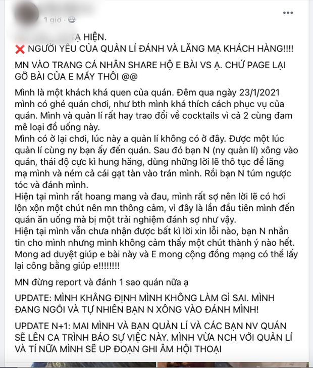 "Mình có ở lại chơi, lúc này anh quản lí không có ở đây. Được một lúc quản lí cùng bạn gái bạn ấy đến quán. Sau đó bạn N. (bạn gái quản lí) xông vào quán, thái độ cực kì hung hăng, dùng những lời lẽ thô tục để lăng mạ mình và ném cả cái gạt tàn vào trán mình. Rồi bạn N. túm ngược tóc và đánh mình.