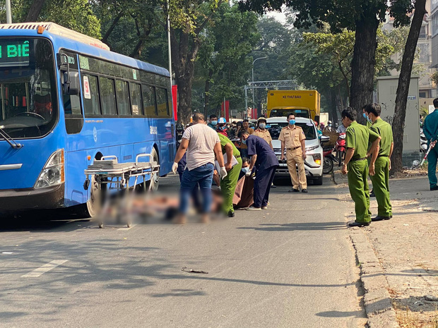 Tại hiện trường, chiếc xe buýt nằm chắn giữa đường, thi thể nạn nhân nằm dưới gầm phương tiện này.