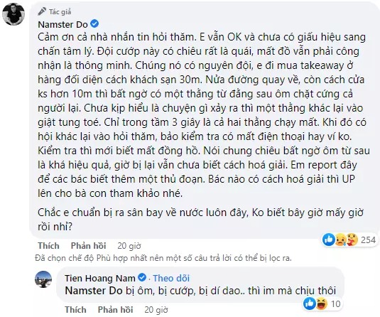 Nhận được sự quan tâm của đông đảo mọi người, trong phần bình luận, người này đã chia sẻ rõ hơn về quá trình bị hai đối tượng khống chế lấy trộm chiếc đồng hồ trên đường về khách sạn.
