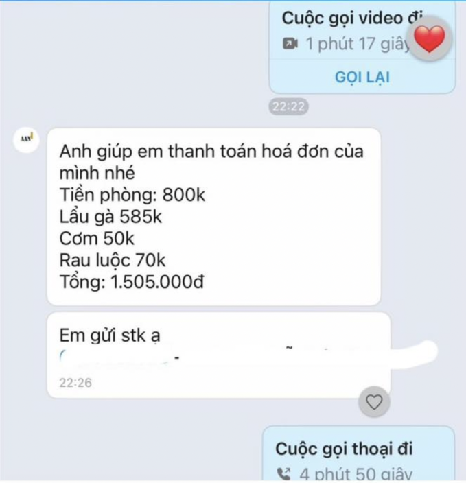 Mình vào nhận phòng, kem đánh răng không có, cốc chén bụi, đồ dùng sơ sài. Lúc này mình vẫn nghĩ có thể là trải nghiệm hay. Vợ chồng mình đi vào buổi trưa nên gọi một nồi lẩu gà nấm 585k. Đến tối mình gọi một bát cơm trắng 50k, một đĩa bắp cải luộc lèo tèo vài cọng giá 70k".