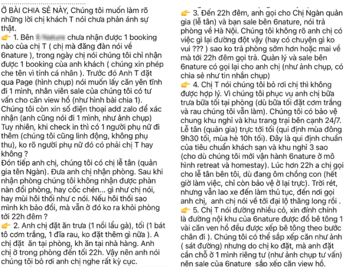Hai vợ chồng còn bức xúc hơn khi liên lạc với bạn sale từng đặt phòng qua page của homestay. Bạn này cũng bảo luôn có việc đột xuất phải đi Hà Nội, rồi nói cũng ở đấy một mình. Hai vợ chồng lập tức đòi lại giấy tờ để về nhưng bạn sale chỉ nhắn chuyển tiền cho homestay trong khi không một lời hỏi han khách hàng. " Dịch vụ cực kỳ tệ họ xem đồng tiền hơn cả lời hỏi thăm khách hàng và cũng không một lời xin lỗi " - hai vợ chồng kể lại.